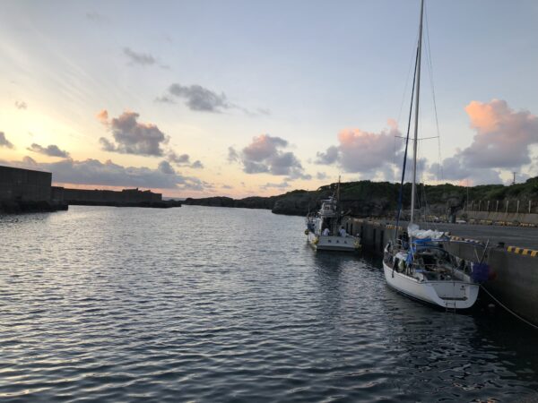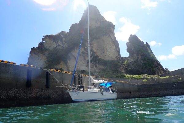 なんとか修理して小宝島の南にあるフェリー港に入港しましたが、うねりが入っており停泊が難しいため、北東の避難港に回り込みました。