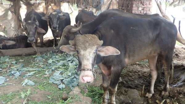 水牛舎の中の様子。見慣れぬ人が来て少し戸惑っていましたが、アルファルファやアブラナ科系の葉を勢いよく食べていました。