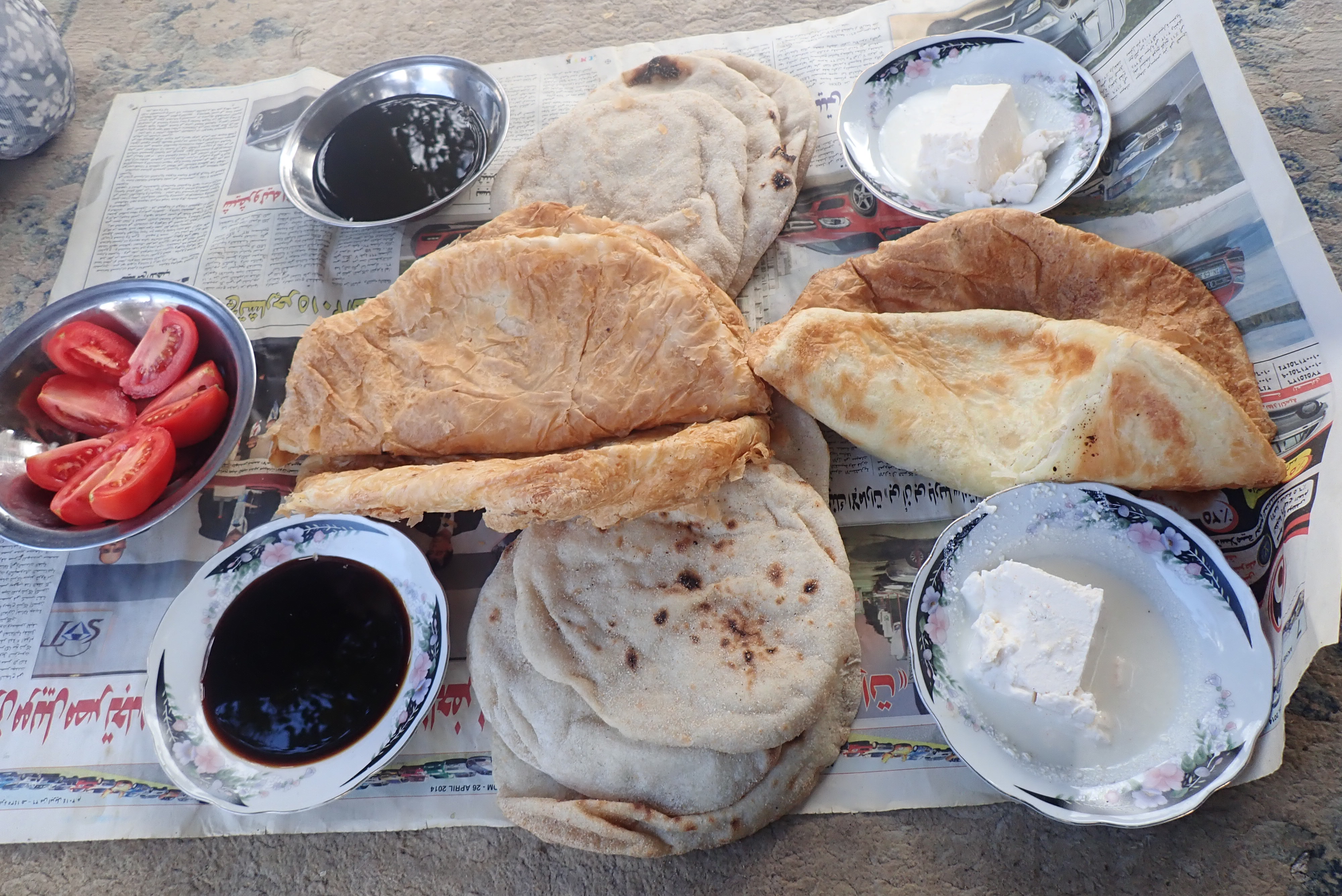 食事はパイ生地のように幾重にも薄い生地が重なっているパンに、スパイシーな香辛料が混ざったチーズと黒蜜を乗せて、収穫した生野菜とともに食べます。