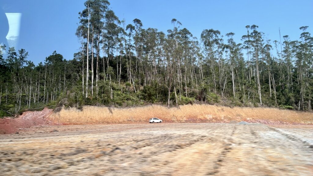 道路を通すために削り取られた山肌からは、豊かに見える森林もいかに薄い表土の上に保たれているかが見て取れます。アフリカの乾燥地でもそうでしたが、赤い岩石の上のごく薄い黒土の部分だけが有機物を含む表土であり、日本など温帯の森林の黒土の厚さに比べれば非常に薄弱な層であることが窺えます。