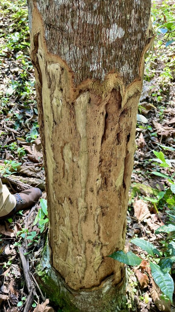 日影調整のために伐採する木は切り倒すのではなく、下の写真のように根本の樹皮だけを一周ぐるっと剥がします。すると水を吸い上げる維管束の部分が失われるので、成長することができず徐々に立ち枯れていき、時間をかけて腐葉土になっていくのだそうです。エネルギーを使わずに手作業で有機物の循環サイクルを制御できる、効率的な工夫です。