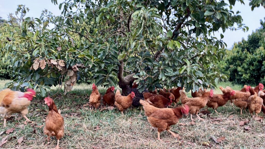 大学の連携圃場に着くと、ニワトリさんたちのお出迎え。この卵や他のフルーツも、São Paolo の Instituto Chão に卸しているそうです。