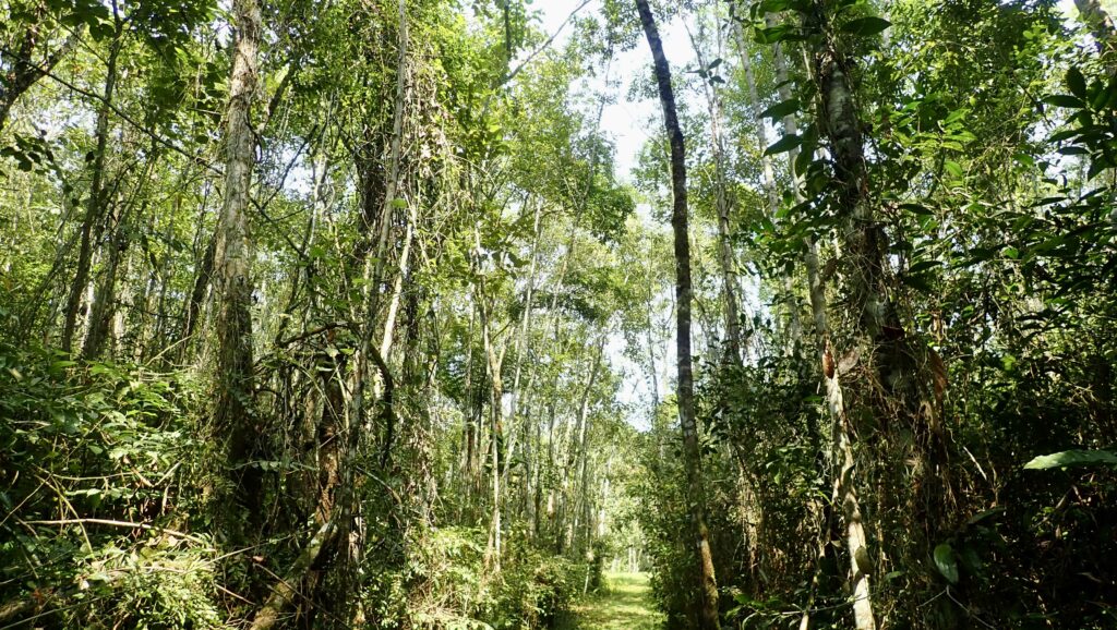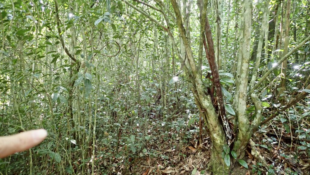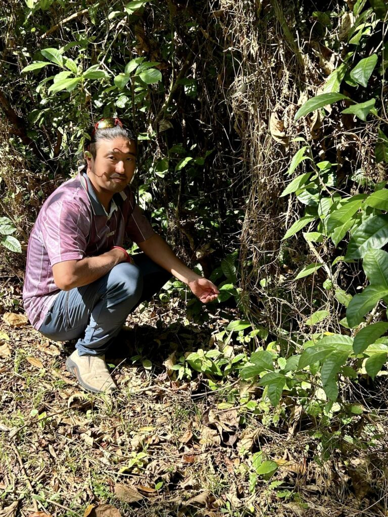この集落ではかつて森林を伐採して単作農業を行っていたのですが、高齢化や若い世代の都市部の移住に伴いしばらく放置されて自然回復した場所があるそうです。そこを新たにお茶のアグロフォレストリーにして国内向け生産とエコツーリズムを展開しており、現地を見学させていただきました。