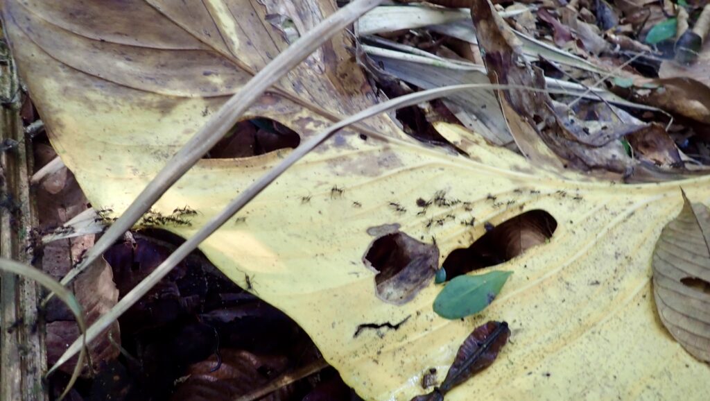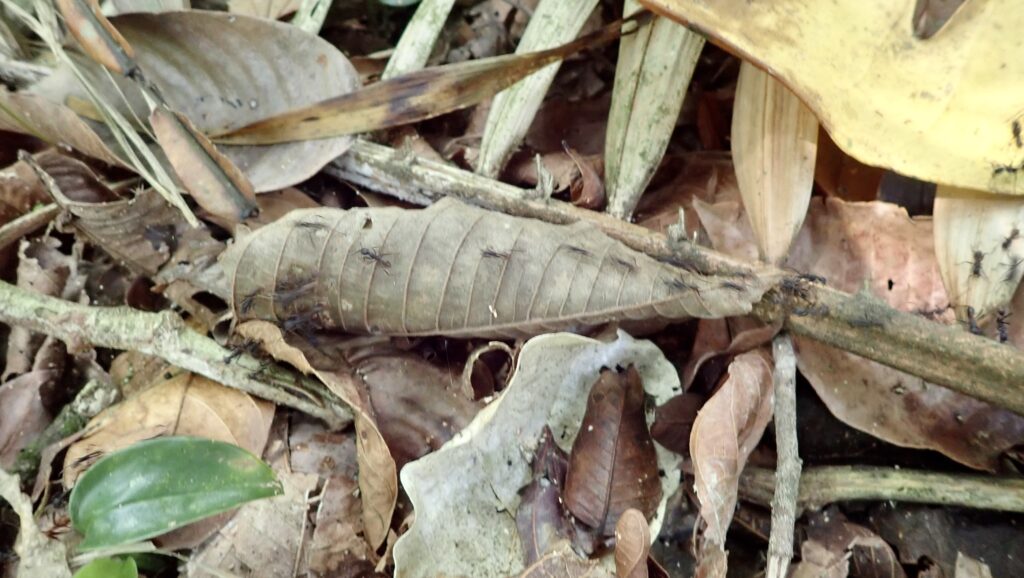 落ち葉の上をよく見るとアリの大行列がそこかしこにあります。噛まれると大変痛いそうですが、今回は手に乗せても大丈夫でした。