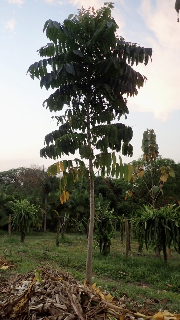 硬い木材として珍重されるマホガニー。枯れ葉を根元に積むだけで、数年でこんなに大きく育つそうです。