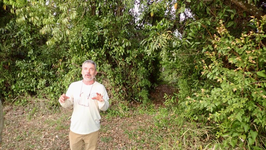 斜面にお茶の木を低く刈り込んで残し、あとはジュサラ(juçara)というヤシの木だけを残して他の木を伐採し、そのまま土に還します。当然ながら、無耕起・無施肥・無農薬でSynecocultureの必要条件にも適合しています。