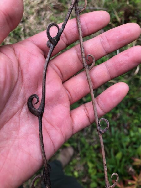 竹林も上から覆い尽くし、動物は傷つけずに植物の上を這い上がる最強の鉤爪を持ったカギカズラ。秋に赤く発色する鉤爪の部分はチョウトウコウという漢方生薬として使われる。