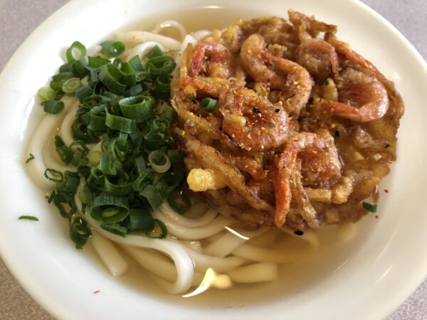 避難するように桜島フェリーに乗り込み、船内の老舗「やぶ金」でうどんの昼食をとります。