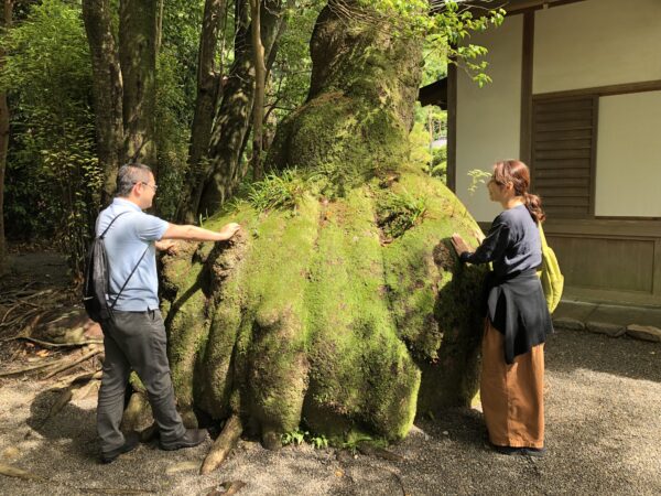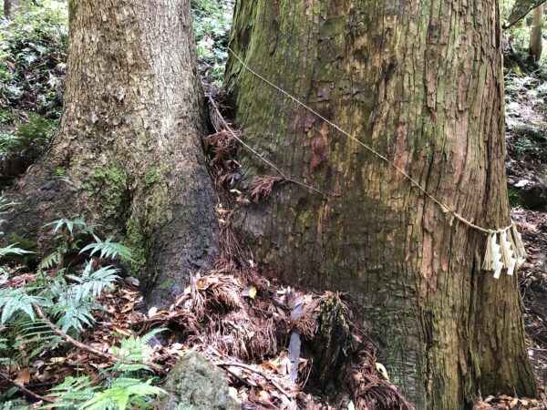 さらに上に山道を登ると、二種類の木が癒合した御神体が祀られていました。