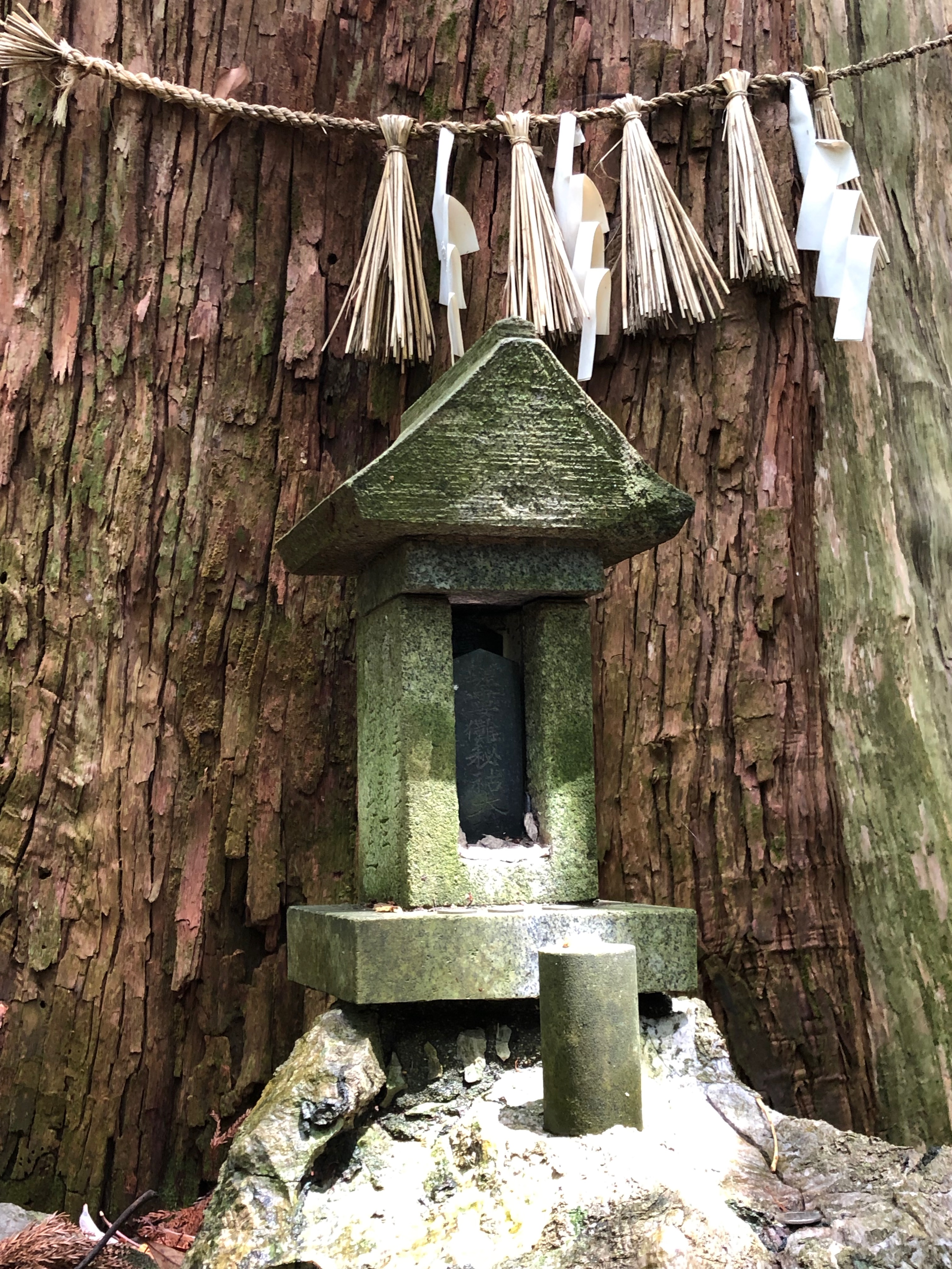 さらに上に山道を登ると、二種類の木が癒合した御神体が祀られていました。