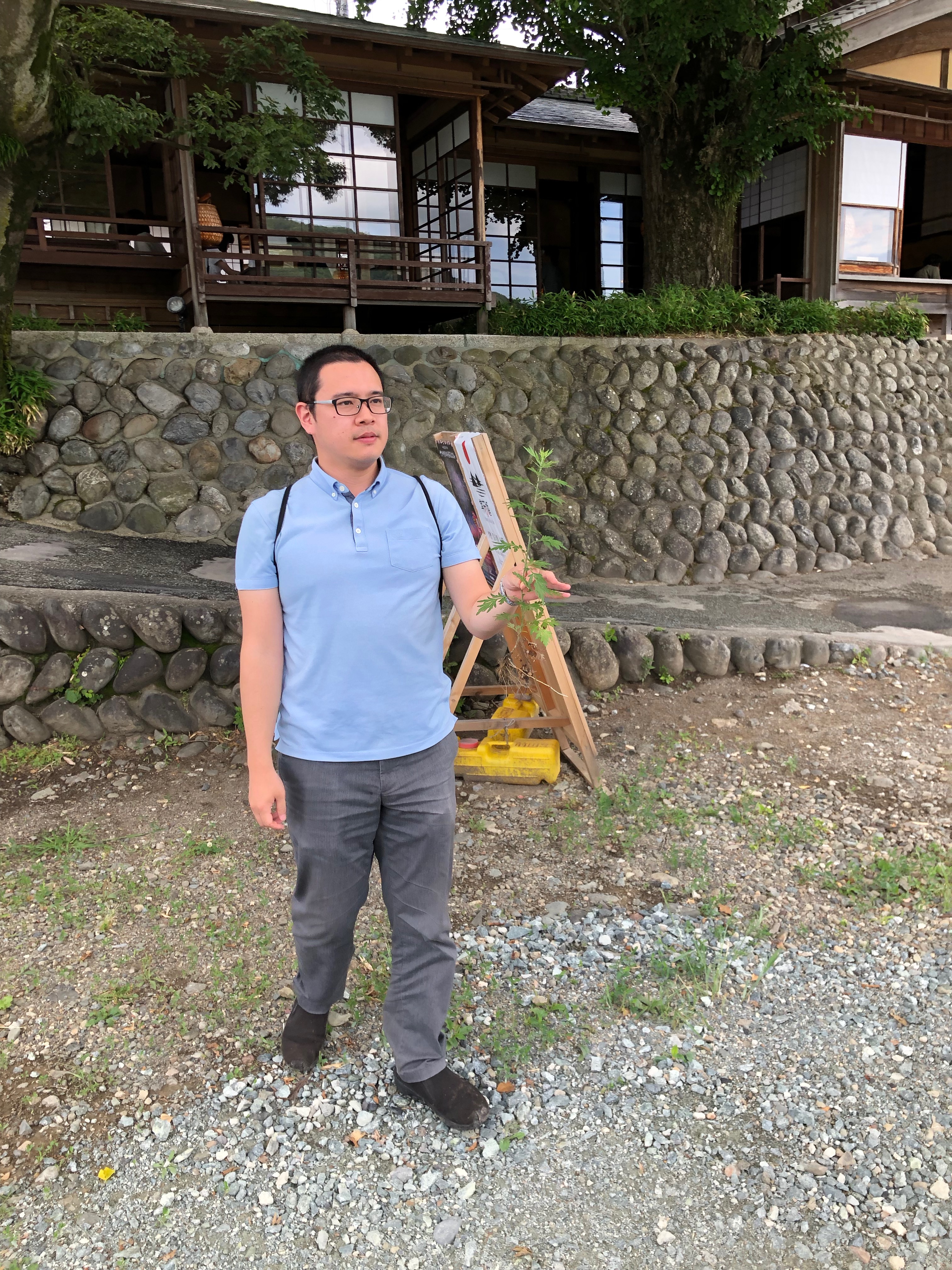 メンバーの一人が河原のヨモギを見定め、採取。