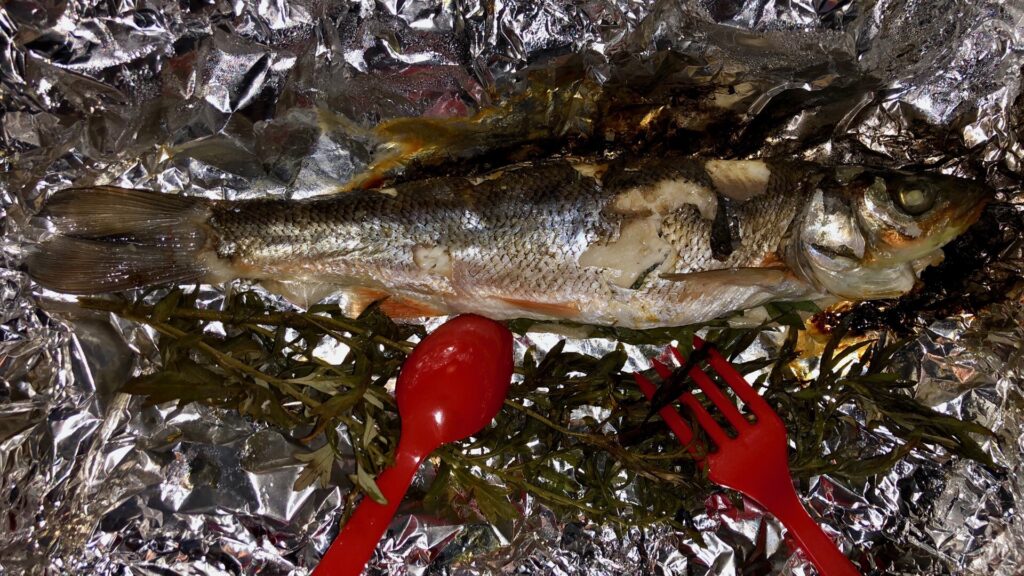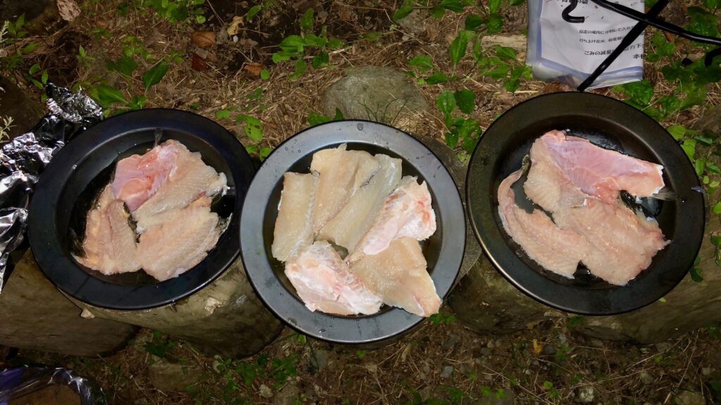 大量の魚の骨や内臓も無駄にせず、3人でひたすら調理して食べます。