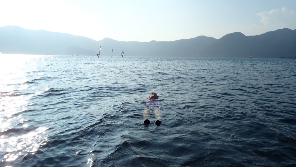 協生農法の前提を構成する協生理論の中には、水中における身体操法が大きな実践的体験知として含まれています。身体の重心と浮心を物理的に理解し、姿勢をわずかに操作するだけで、老若男女誰でも簡単に浮き続けることができます。