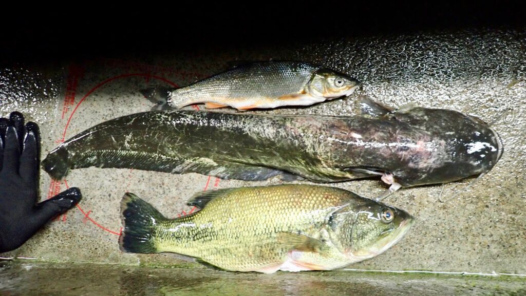 本日の獲物は60cm超のナマズ、40cm超のブラックバス、25cmのハス。※本栖湖ではニジマスに漁業権が設定されており、ニジマスを捕獲する場合には遊漁券が必要です。