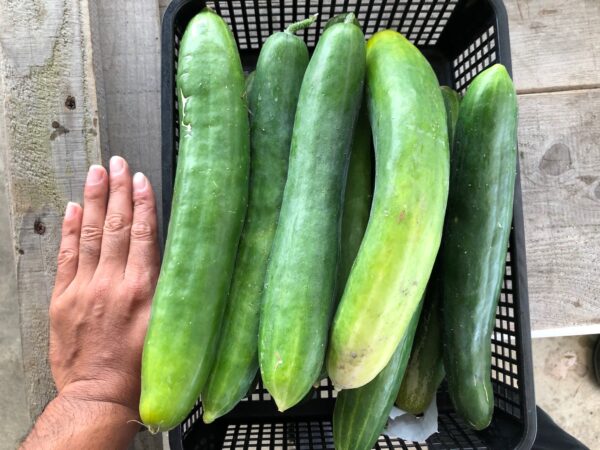 慣行では小さく青いうちに収穫するキュウリですが、協生農法では大きく熟してその名の通り「黄ウリ」になってからも夏の主力産物として活用します。