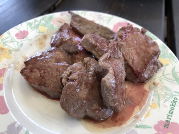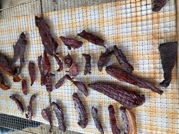 食後には海水を100%煮詰めて作った協生ムー塩とイノシシジャーキーの出来立てを試食。