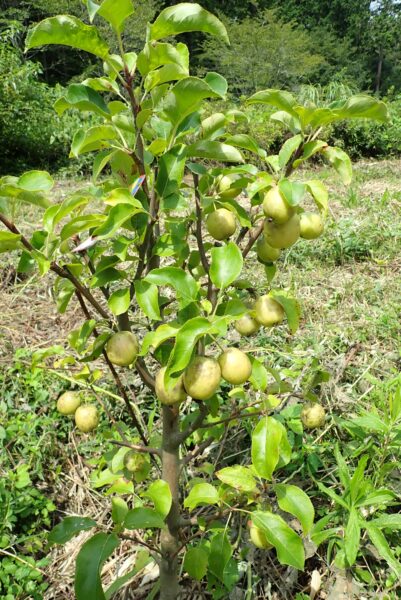 姫リンゴが枝もたわわに結実し、すでに食べることができます。協生農法では無耕起・無施肥・無農薬の「普通のリンゴ」と呼んでいます。