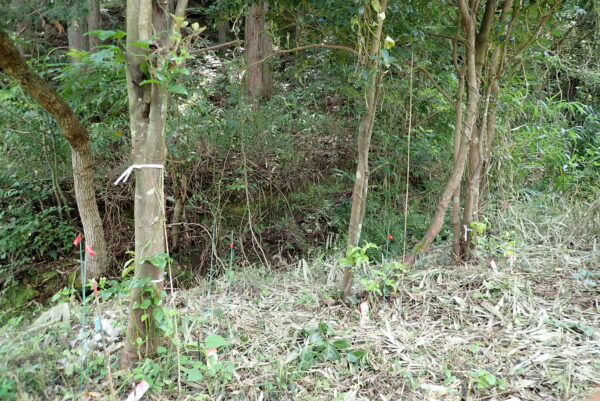 放置された杉檜林を剪定し、生かしたまま農園のフェンスやパッションフルーツやキウイなどつる性果樹を這わせる棚として利用しています。