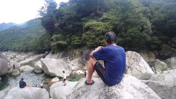 皆が水遊びするのを高台から見守る野人・大塚さん。