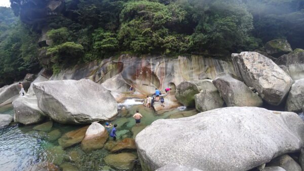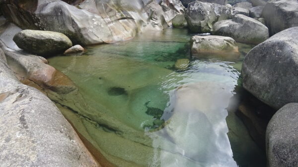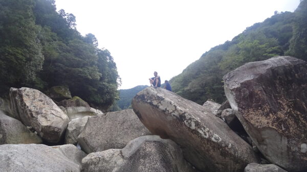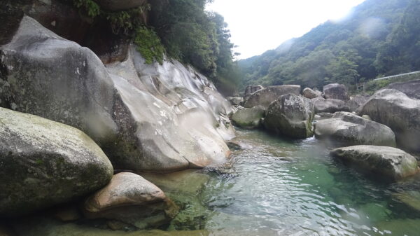 川に沿って巨岩が立ち並び、滑らかに削られた曲面が天然の滑り台を形成しています。