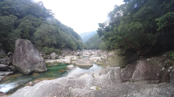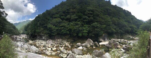 車で銚子川を遡り、原生林に囲まれて豊かな水が吹き出す川の中流へやってきました。