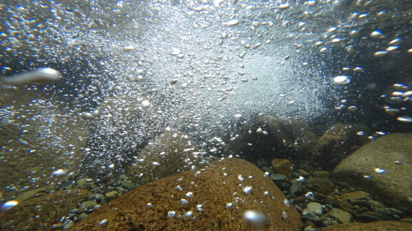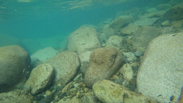 川の中は透明度が高く、大小様々なハゼやアユなどの魚が急な流れにも俊敏に反応しながら群泳していました。