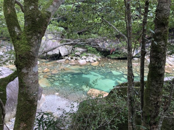 苔むした林からそっと覗くと、激しい水流にえぐられた川床の巨大な岩の間に、青いプールが光る水を湛えています。