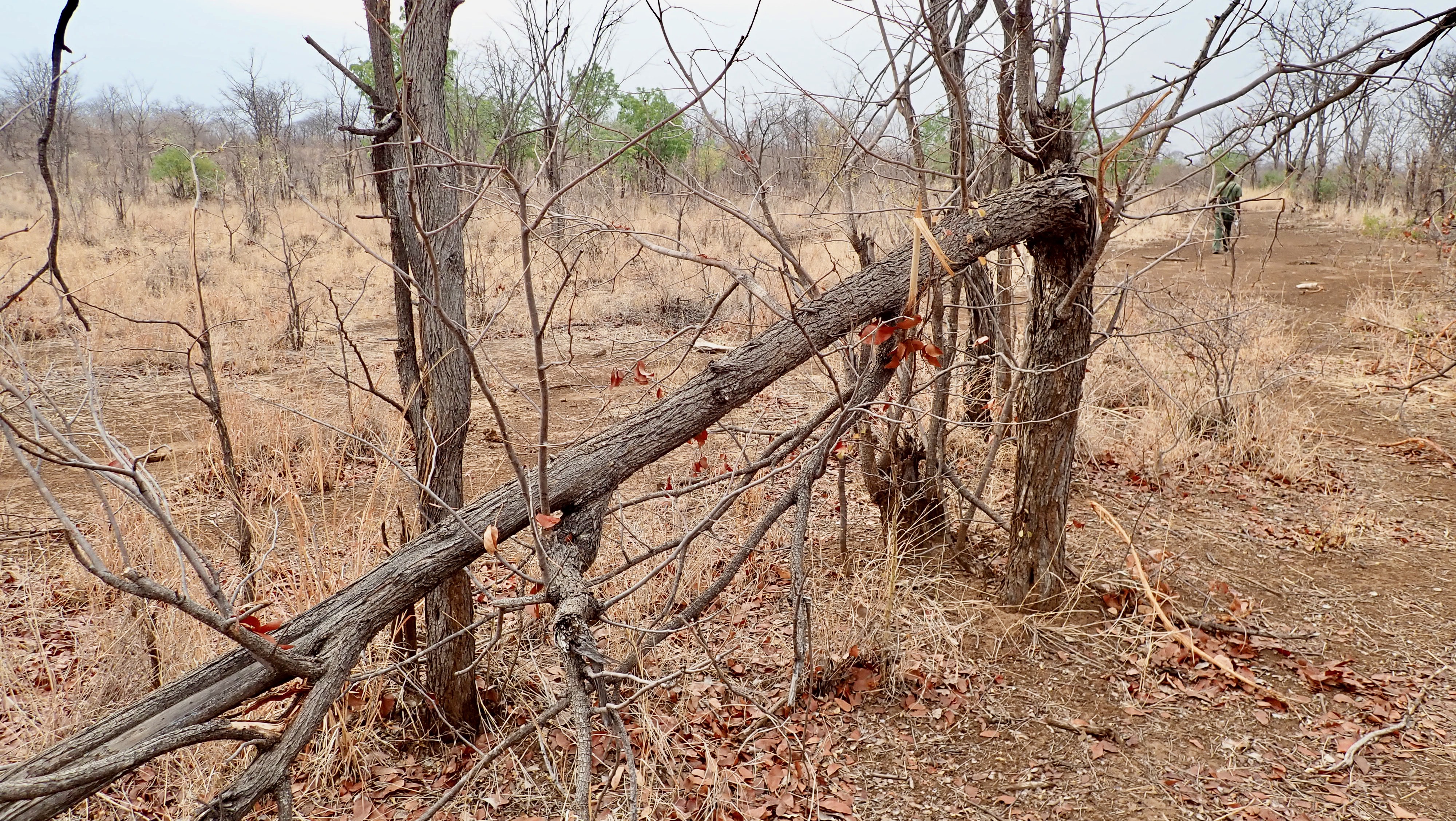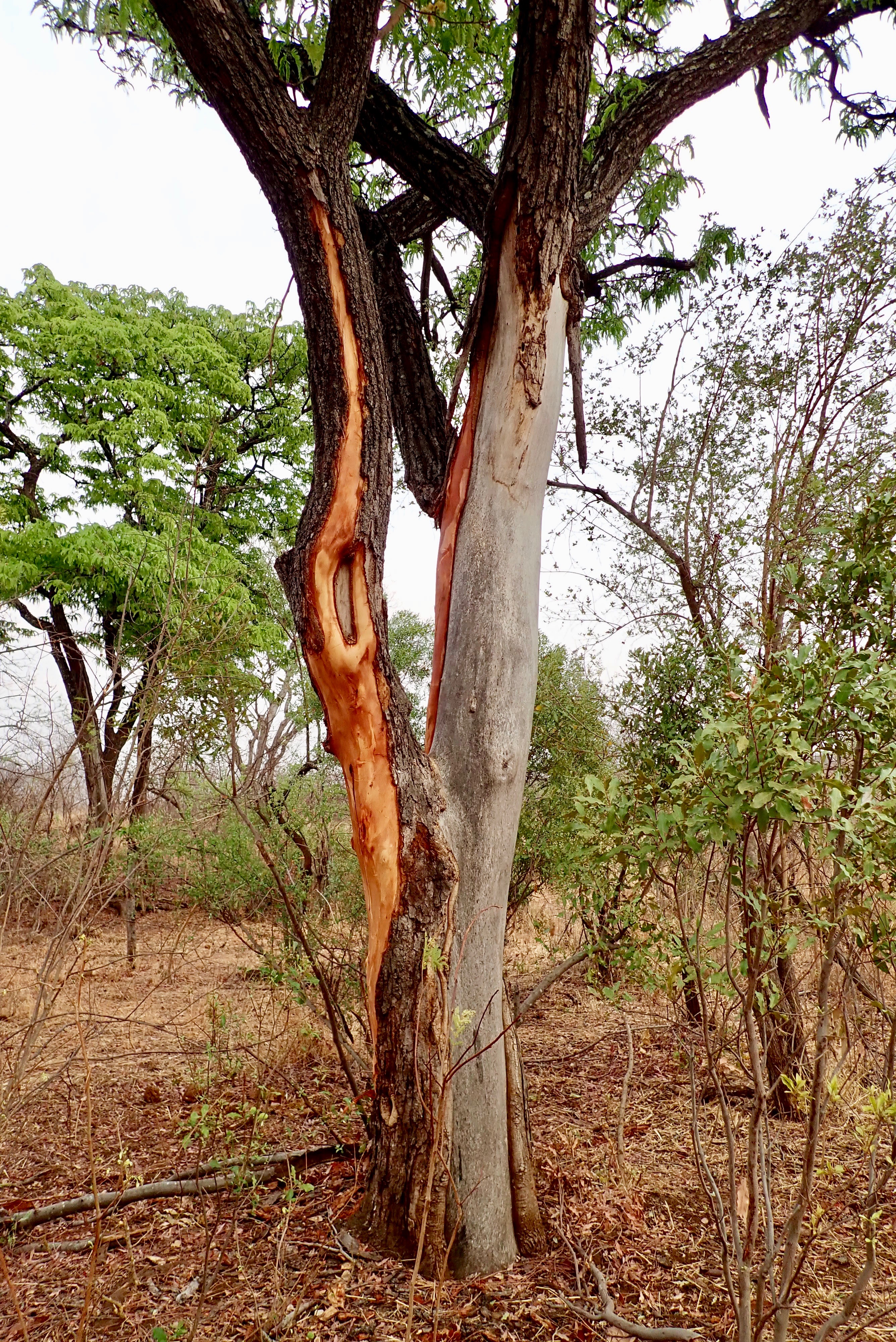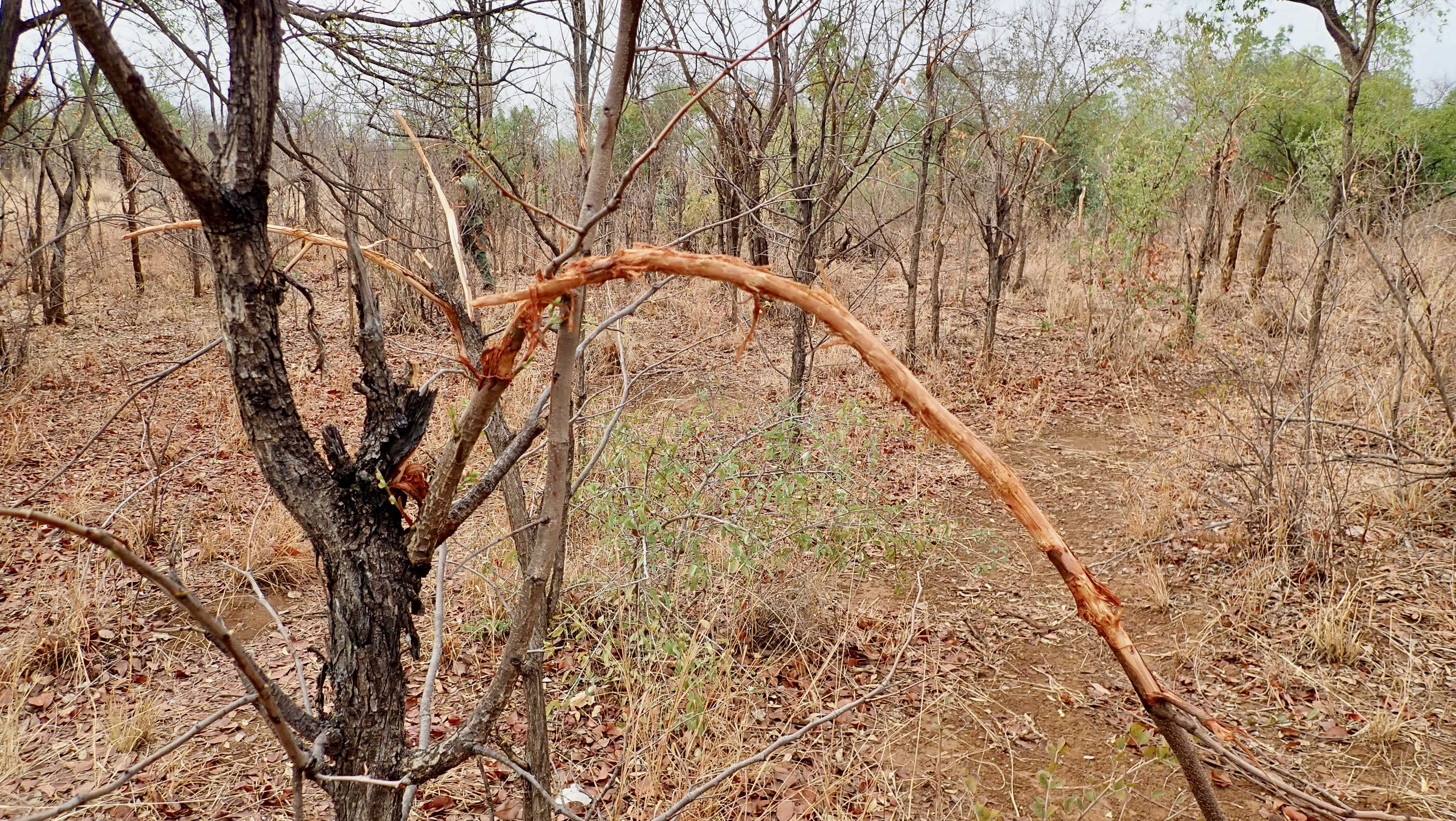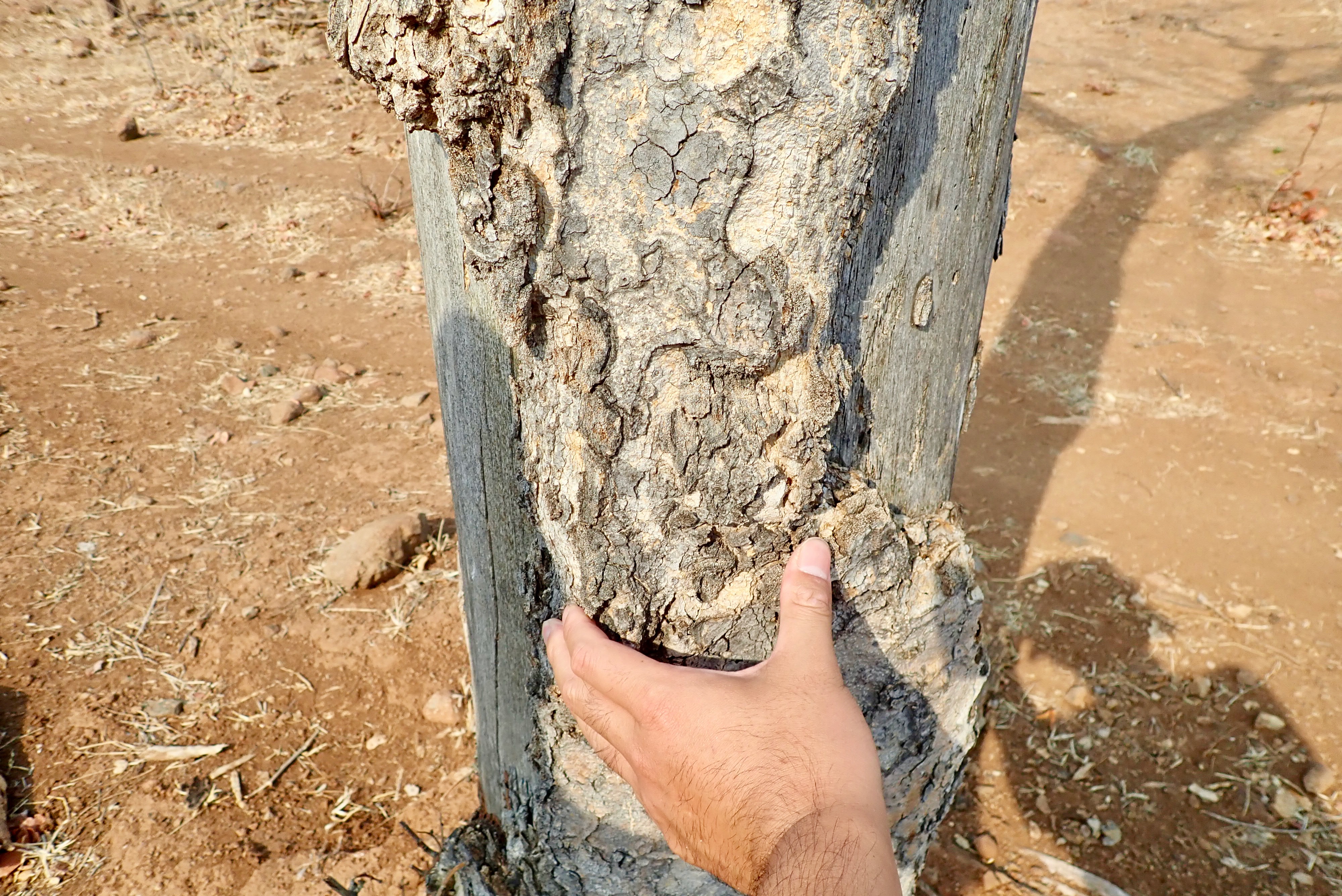 Tree with bark peeled off by elephant. If the bark peels off all around, it will die.
