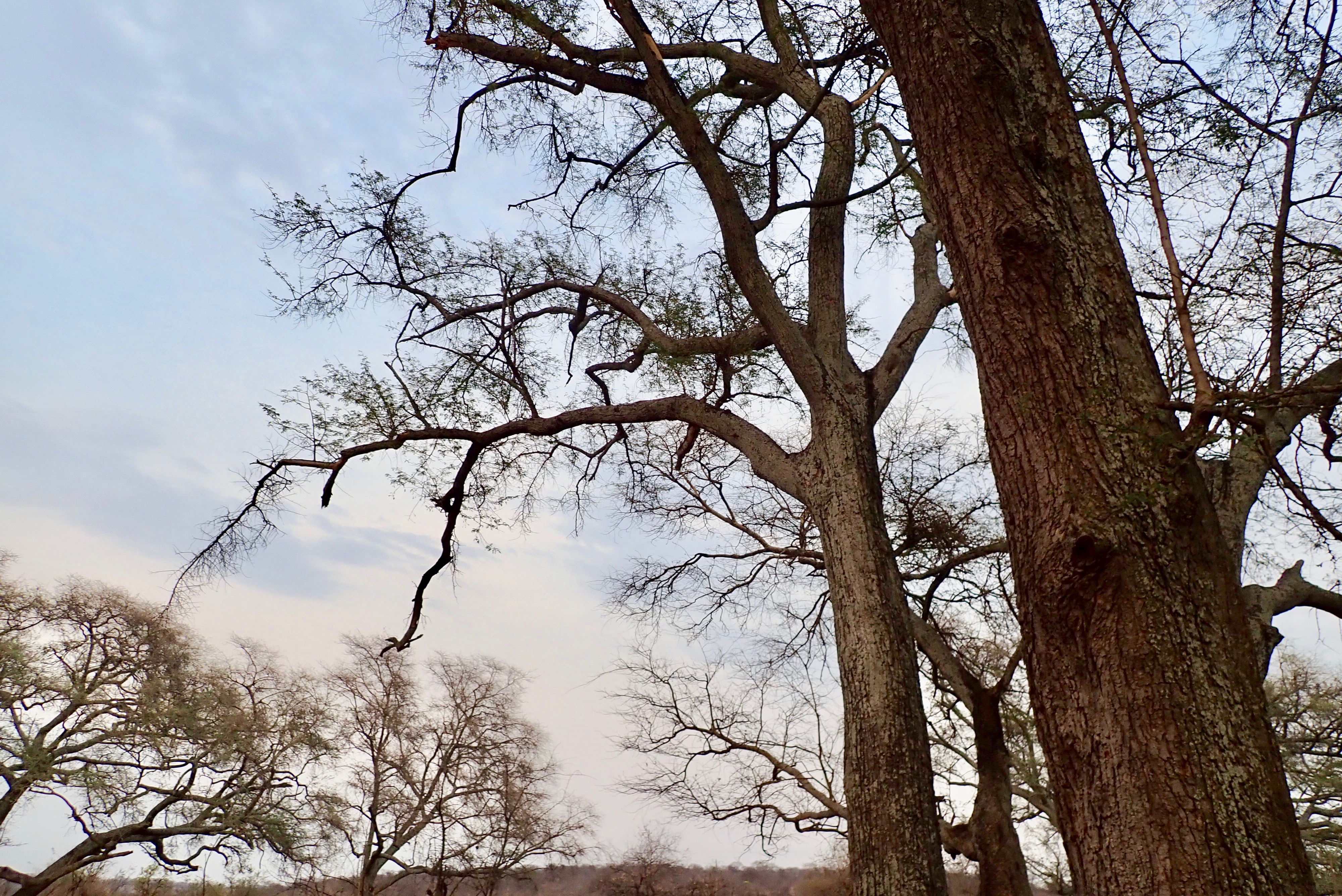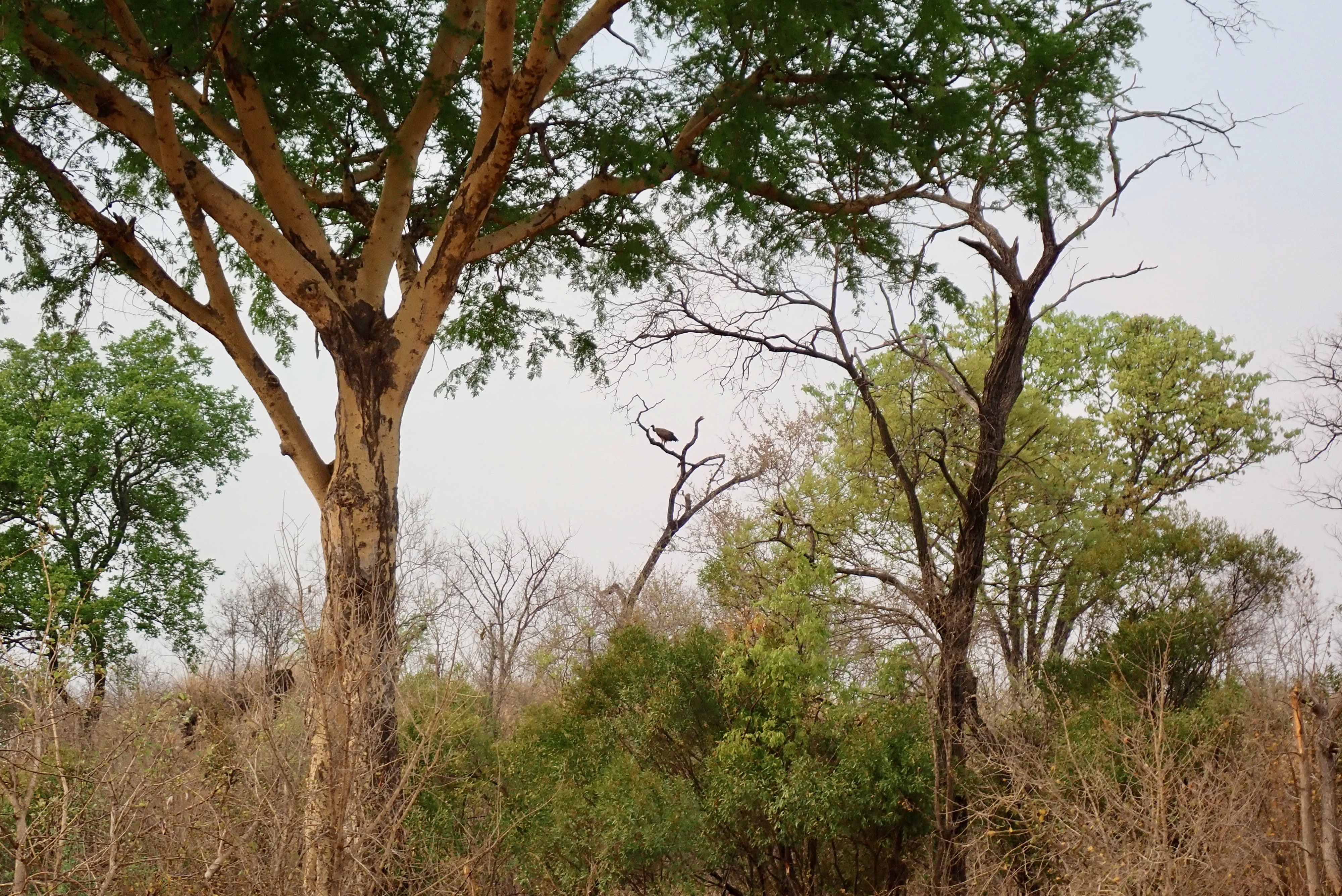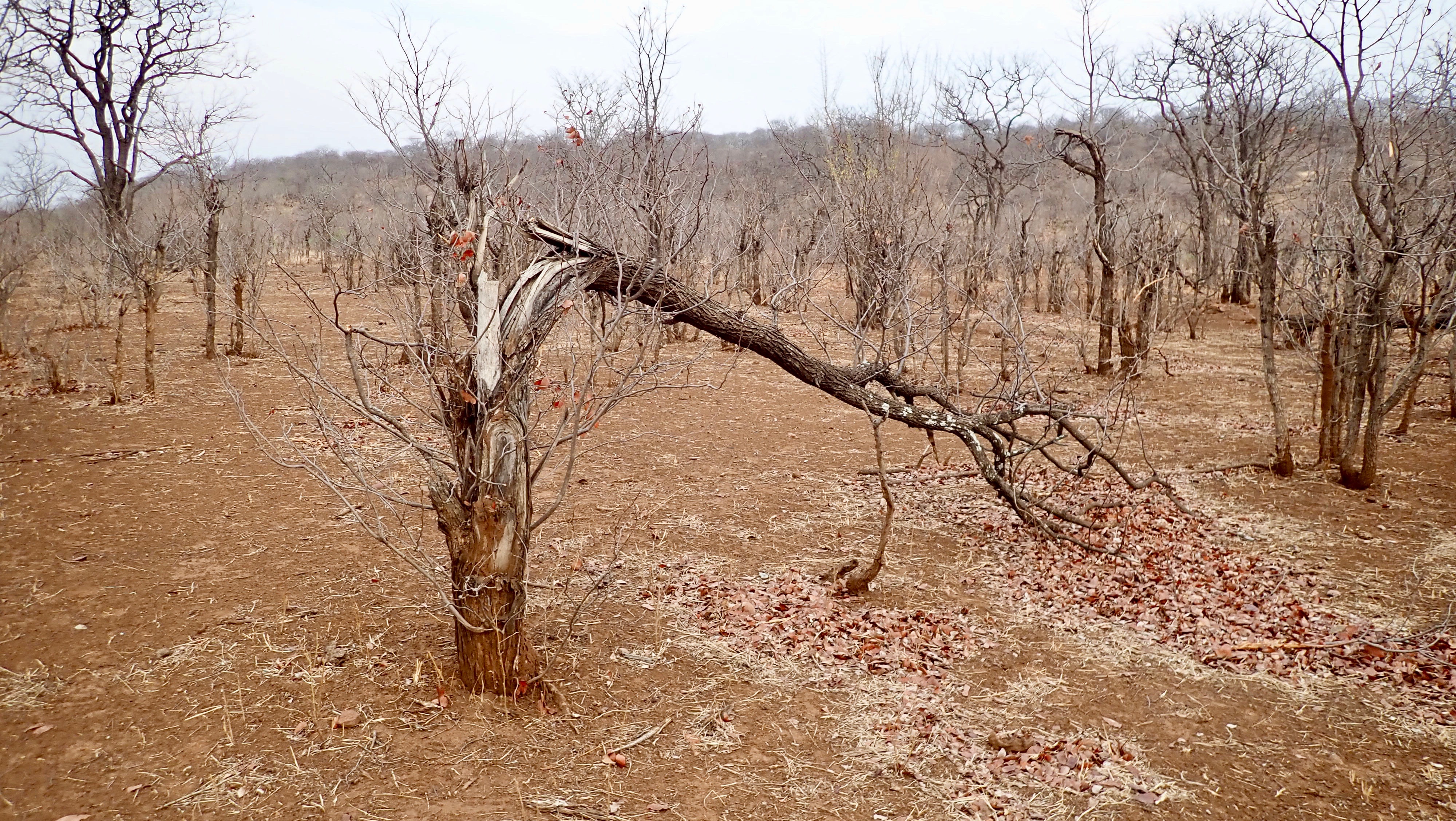 Tree with bark peeled off by elephant. If the bark peels off all around, it will die.