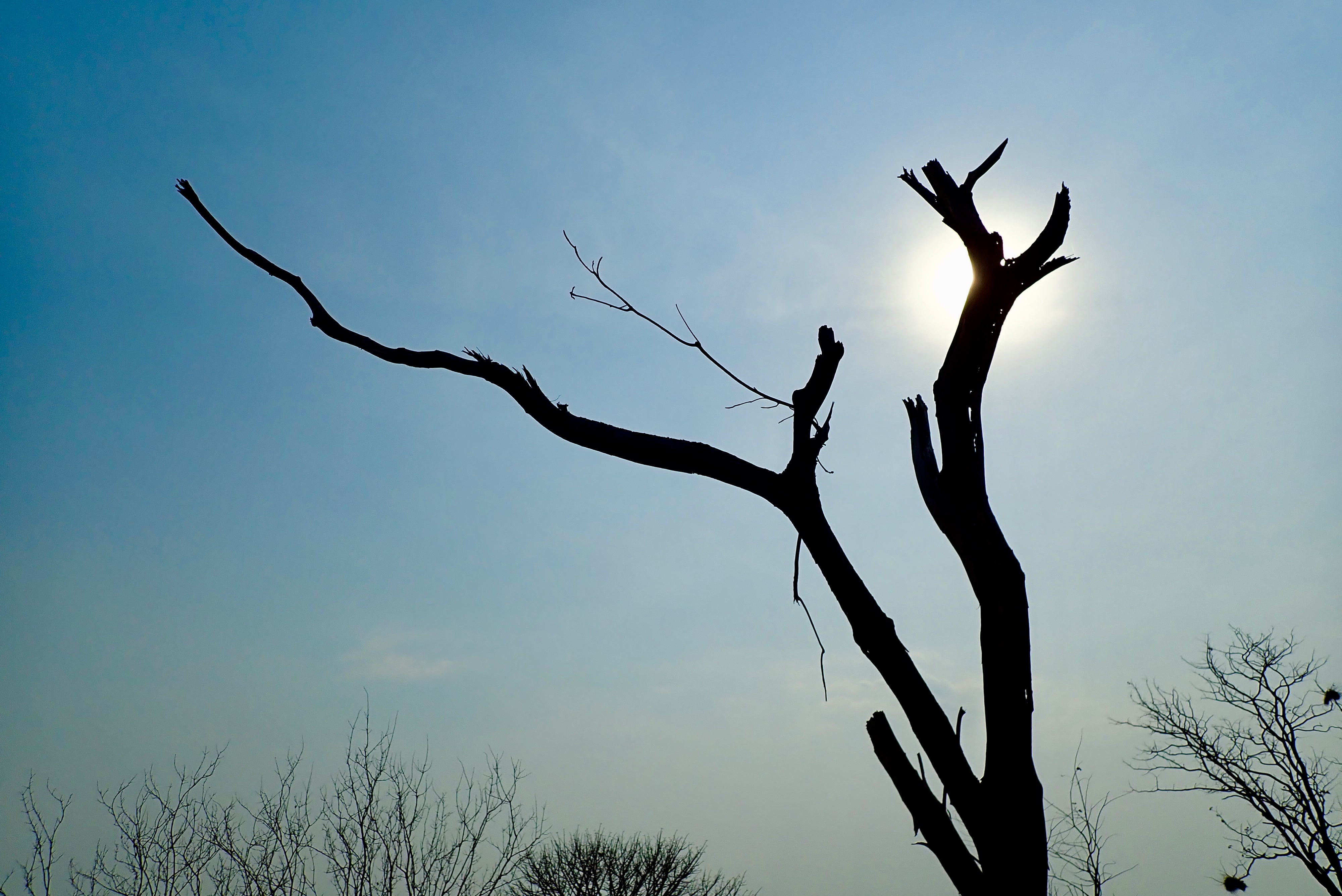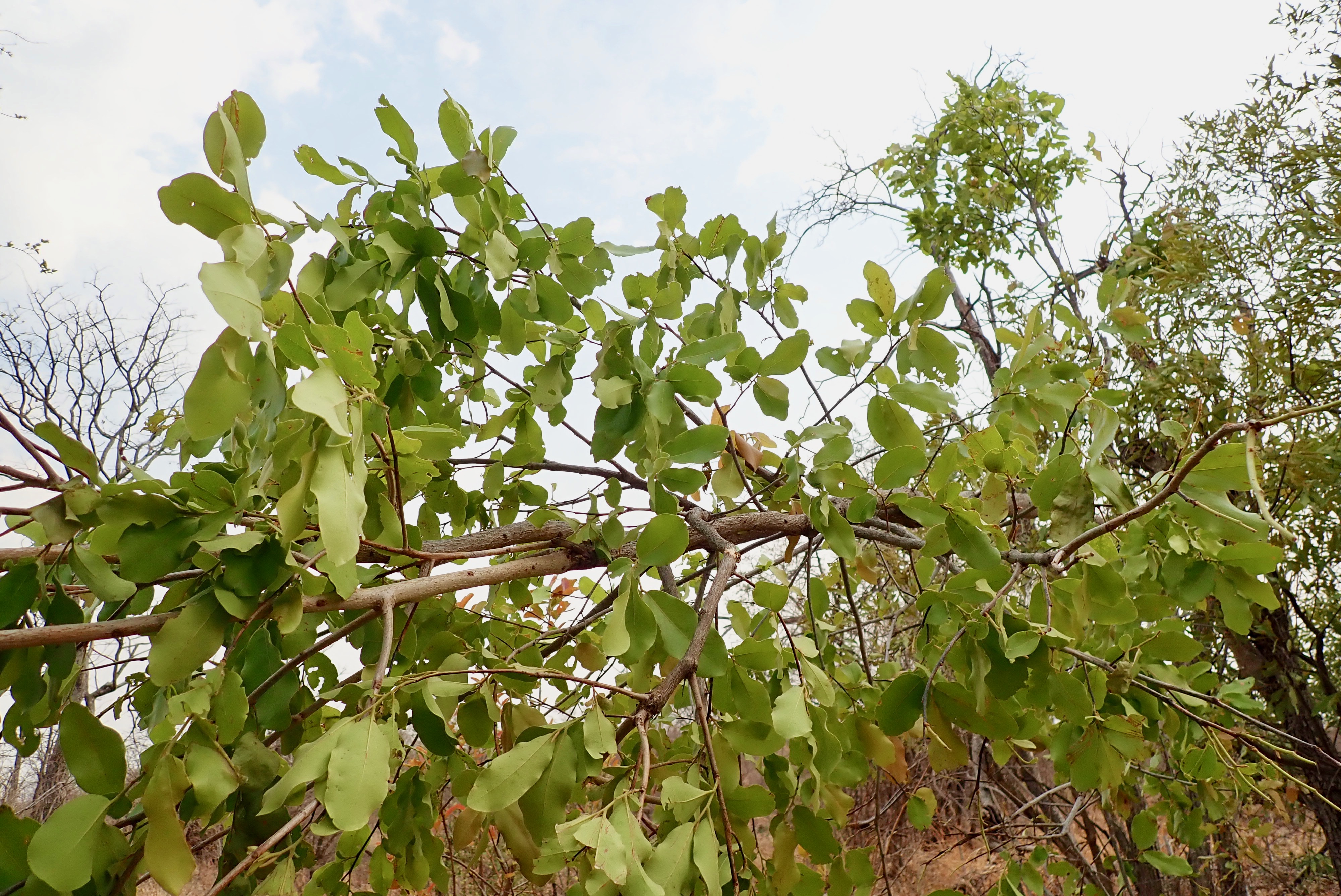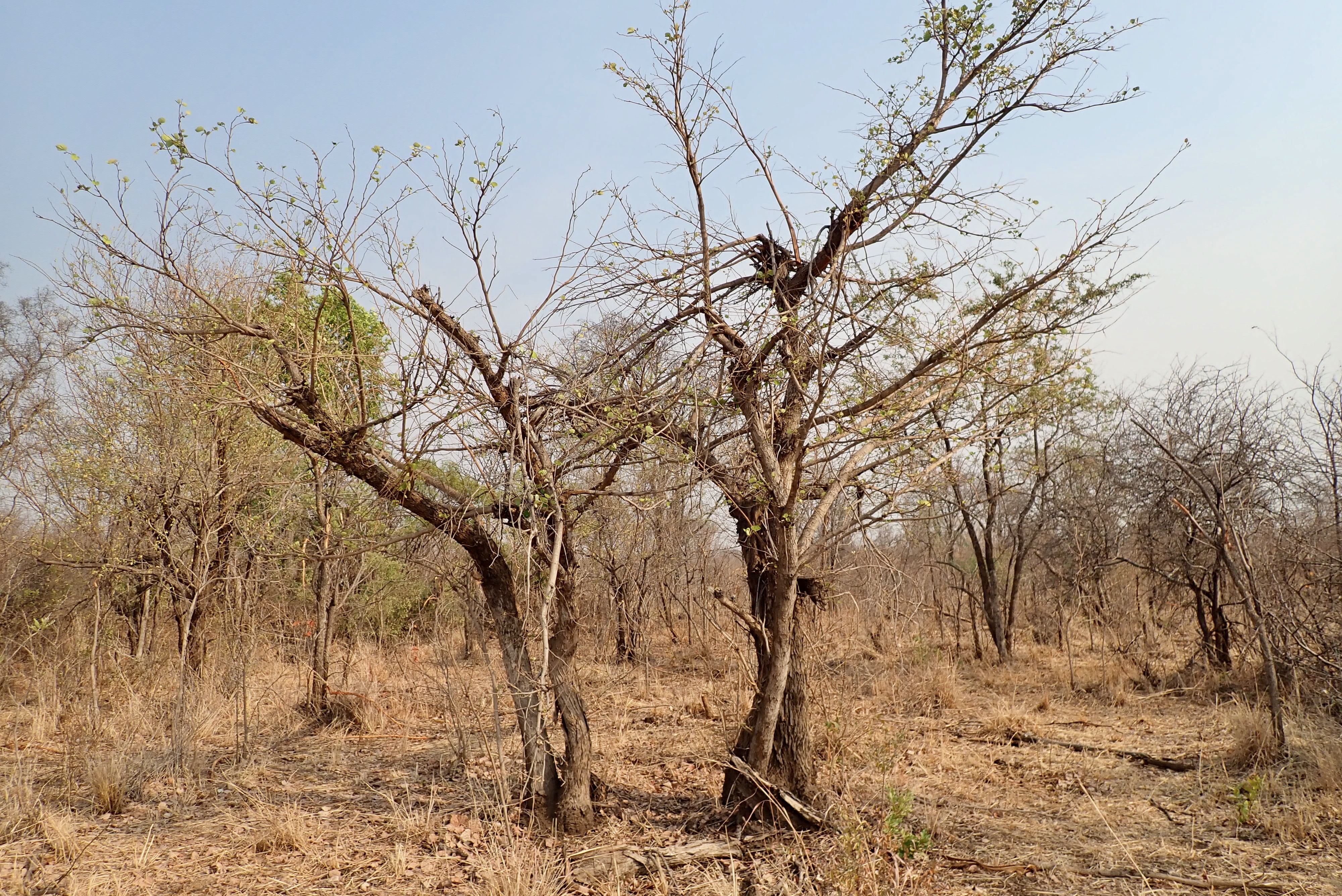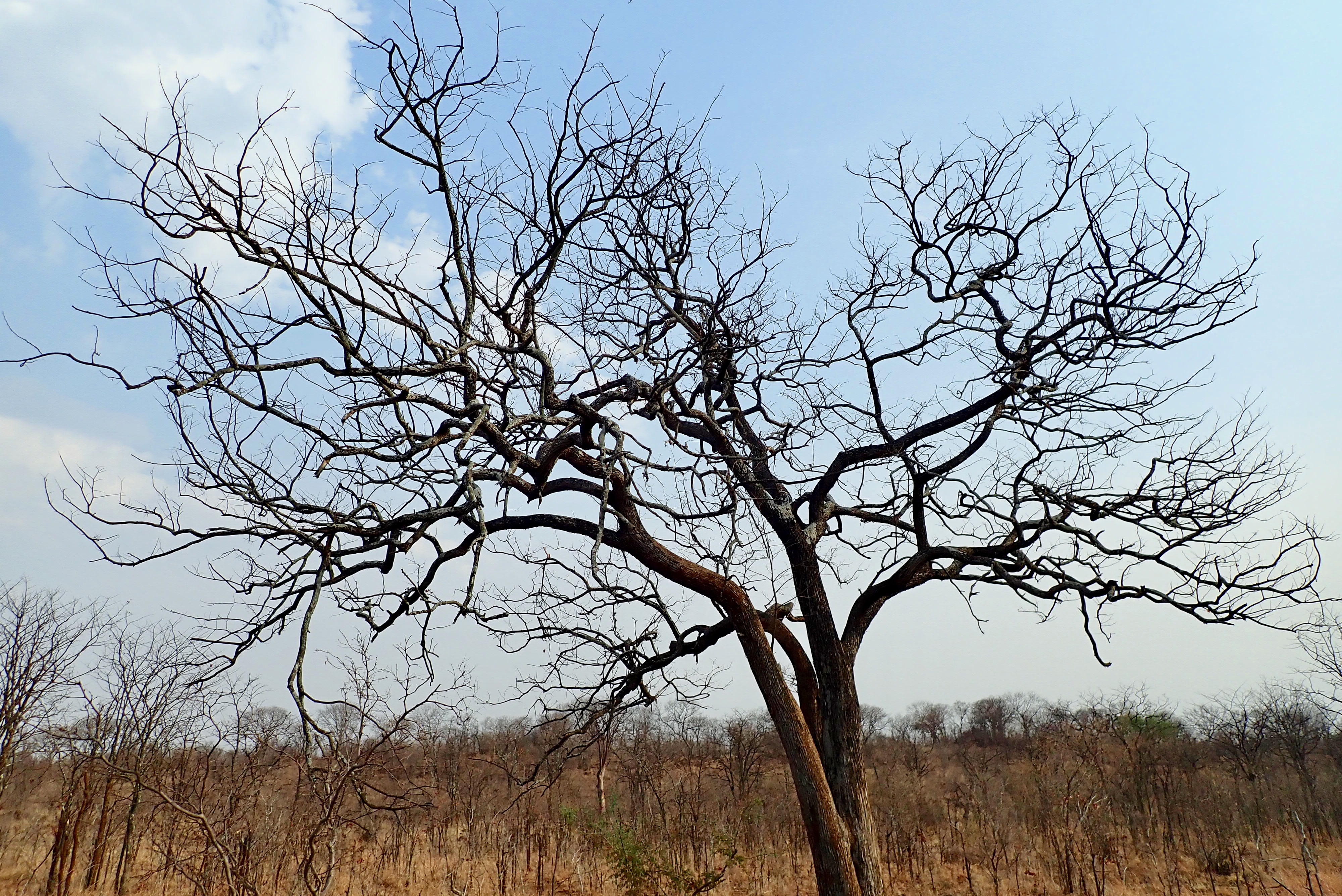 Tree with bark peeled off by elephant. If the bark peels off all around, it will die.