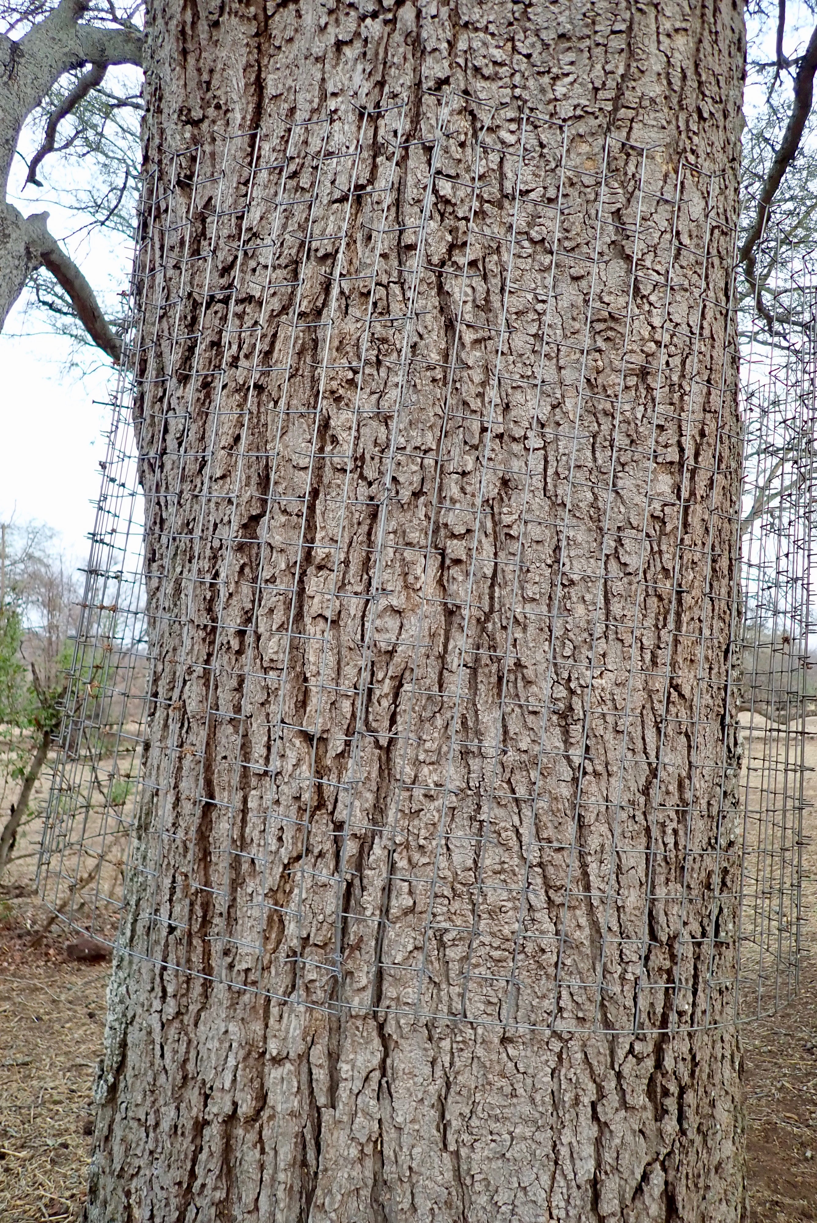 Tree trunk is covered with spiky wire mesh to prevent the damage by the elephants.