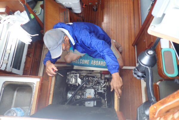 すると、突然エンジン停止。すかさずジブセイルを開いて風の力だけで走りながら修理します。