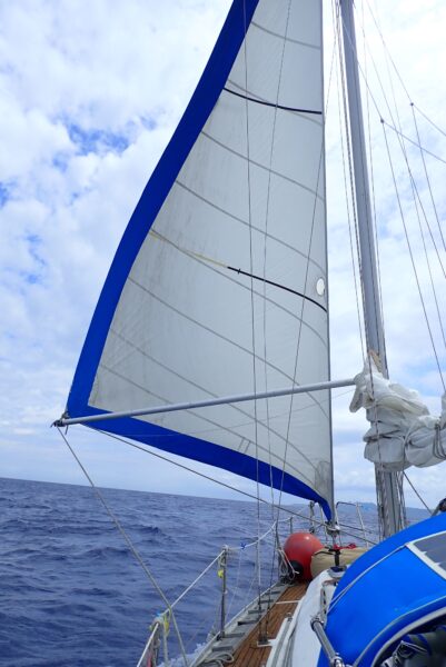 完全な追い風なので、ウィスカーポールを張り出して走ります。レース艇ではないので速力は5ノットが良いところですが、風を動力に、時間を燃料にして進みます。