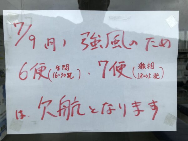 台風8号の接近の影響で、帰りのフェリーが欠航。