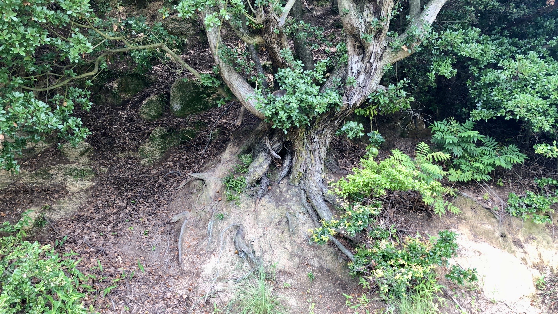 硬い巌のような岩盤の上にも、巨木がずっしりと根を下ろしています。