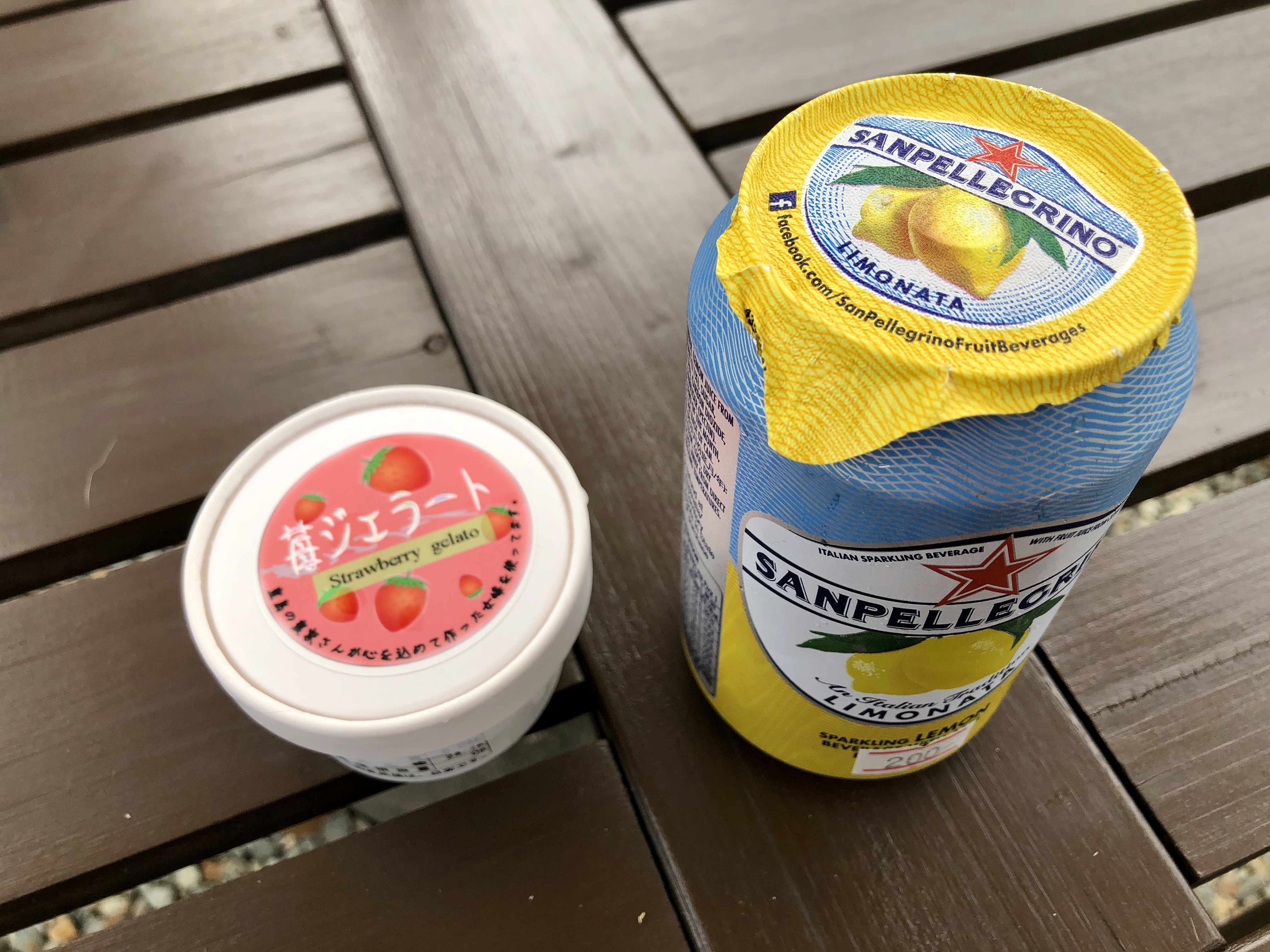 熱中症を避けるために、豊島産イチゴのジェラートをいただき水分補給。