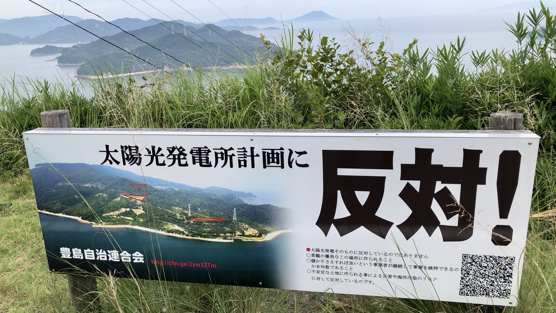 この看板にあるように、島の方々はソーラー発電自体に反対しているわけではありません。設置業者が景観に対する配慮をせず、この斜面のすぐ下にある良質な漁場へソーラーパネルの洗浄液が流れ出ることに対する環境対策もせず、さらにソーラー発電所を作ったらすぐに外資系の企業に売却すると公言しているため、全く管理責任や後世への影響を考えていないことに対して反対しているのだそうです。