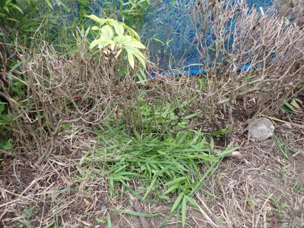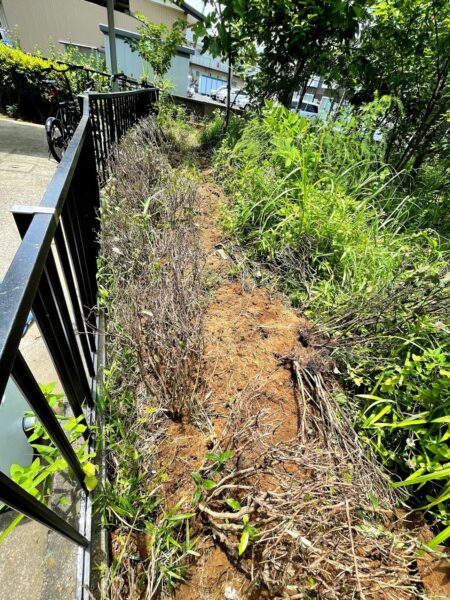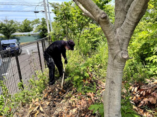 チャノキを定植した時に根元に草マルチをして保湿するため、農園内の草を刈って集めておきます。