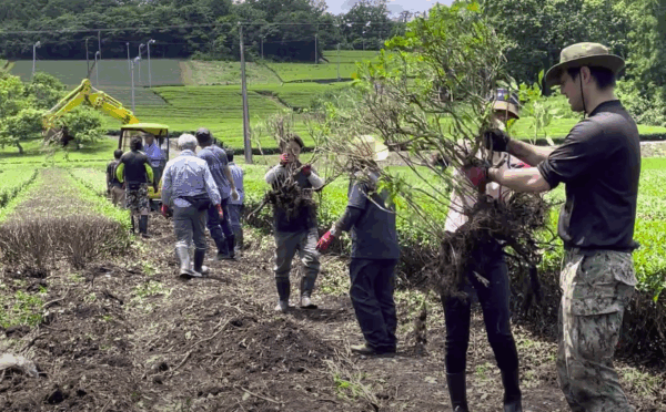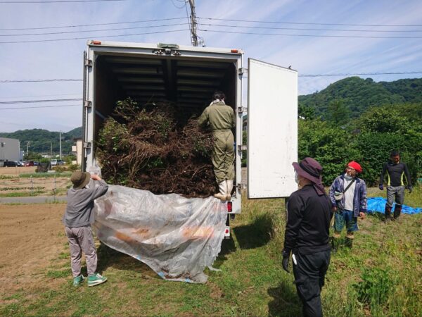 伊勢の茶園から取り払うチャノキは大磯の協生農園へと移植するため、ユンボを使って根元の土ごと掘り起こした後、乾かないよう速やかにトラックへと積み込みます。桜自然塾、富士協生果樹農園、茅原農園に関わる伊勢市の方々と協力して、バケツリレー方式で次々と運び出します。4.6トントラックいっぱいに詰め込んで360本が積めました。