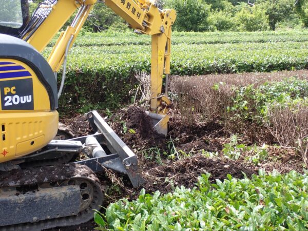 (社)シネコカルチャーから(株)桜自然塾に提案した協生茶園のデザインでは、チャノキの畝と果樹・野菜の畝を交互に配置します。そこで果樹・野菜畝を造成するために茶園の一部の畝からチャノキを取り払います。