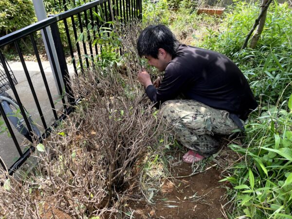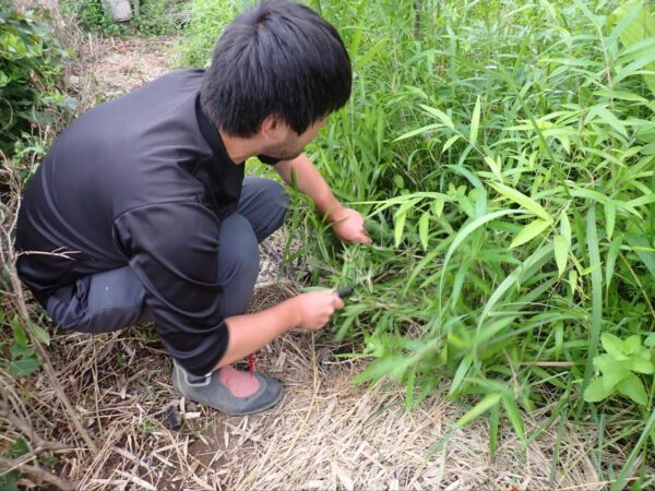 次に伊勢から届いたチャノキを大磯の協生農園に定植する様子を紹介します。大磯農園でのチャノキ移植の主目的は、研究データの収集に加えて、クラフトティーを初めとする協生産物の加工方法の探索です。