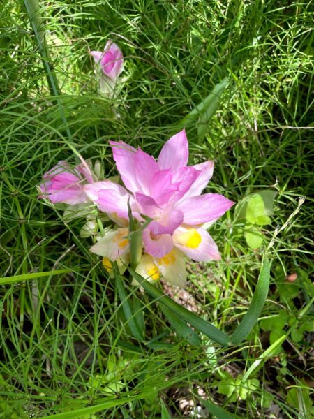 この時期、大磯農園ではいたるところにウコンの鮮やかなピンク色の花が見られます。ウコンの花は、実は仮雄蕊(かゆうずい)という生殖機能を持たない雄しべだそうです。