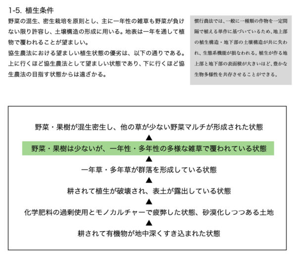 「前」と「後」のことを考えている間、協生農法実践マニュアルのある部分が何度も思い出されました。マニュアルの15ページ、植生条件の図の上から二段目「野菜・果樹は少ないが、一年性・多年生の多様な雑草で覆われている状態」という部分です。