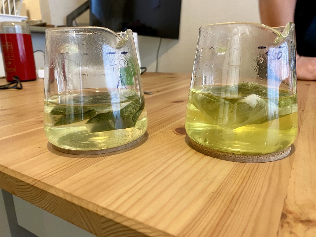 今回の簡易製茶によるシネコ茶は、色が鮮やかで味が軽くクリアですが、若干青臭さが際立つ印象です。後味はクリアです。一方の伊藤園は、甘みがあり若干ねっとりと口に残る感じがあります。