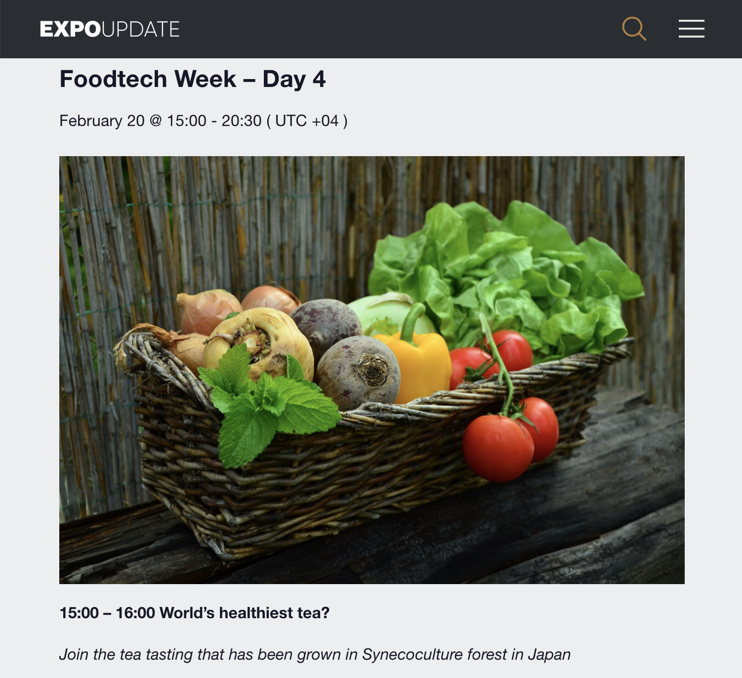 World Expo 2020 では、Sweden Foodtech が Synecoculture について紹介し、シネコ茶の試飲を行いました。