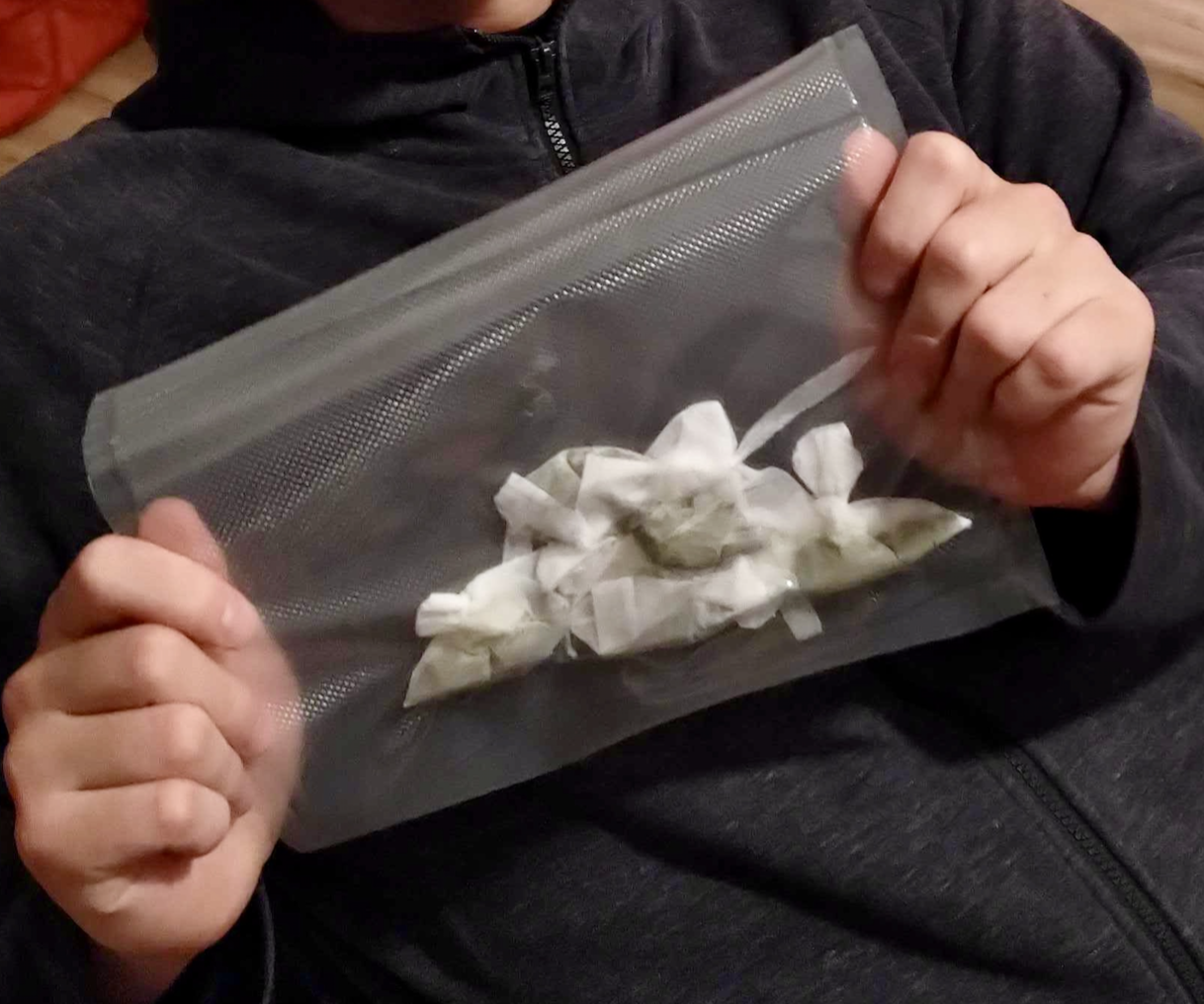 70℃の乾燥機で仕上げたらミルで粉砕し、ティーバッグに詰めて完成です。