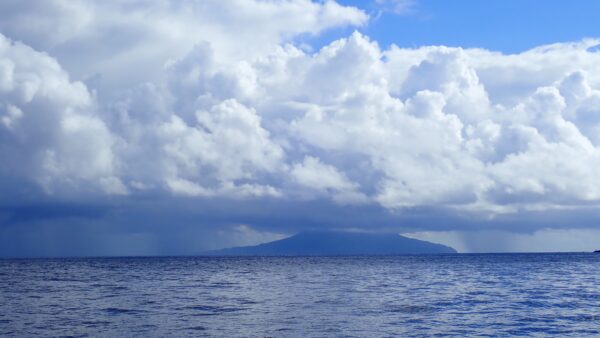島裾は雨でけぶり、大空には噴煙と雲を従えている。