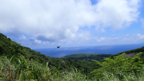 中腹の斜面から見下ろした元浦港から北側。水平線に悪石島が見えます。