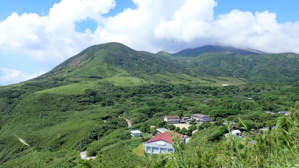 高台より見下ろした小中学校、左に根上岳、右奥に噴煙を吹く御岳。