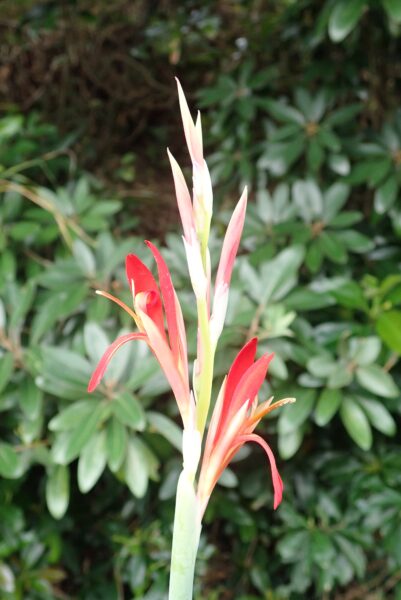 リンゴツバキや、ダンドク、ショウガ、ハイビスカスなど亜熱帯のカラフルな花が人寂しげに咲いています。